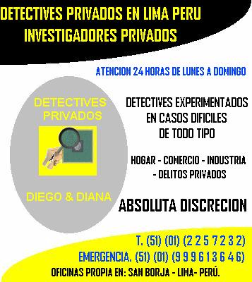 Detectives privados en Lima Peru investigadores Privados; Bienvenidos a nuestra web Detectives Privados DIEGO & DIANA especialistas en casos complejos vinculados con el: El HOGAR - Infidelidad conyugal atendidos por nuestros de Detectives Privados Infidelidades - COMERCIO - INDUSTRIA - BANCA - CIAS DE SEGUROS - ASUNTOS PERSONALES RESERVADOS . Brindamos investigaciones privadas en todo el Peru y extranjero, Teniendo en cuenta siempre que su problema es nuestro problema para solucionarlo con absoluta discreción, posteriormente suministramos a nuestros clientes pruebas en base a filmaciones de hechos reales ocurridos, las mismas que es de utilidad para el solicitante con la finalidad de hacer prevalecer sus derechos referente a lo emocional patrimonial y personal, con conclusiones claras y precisas sin dudas.